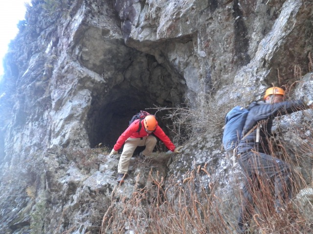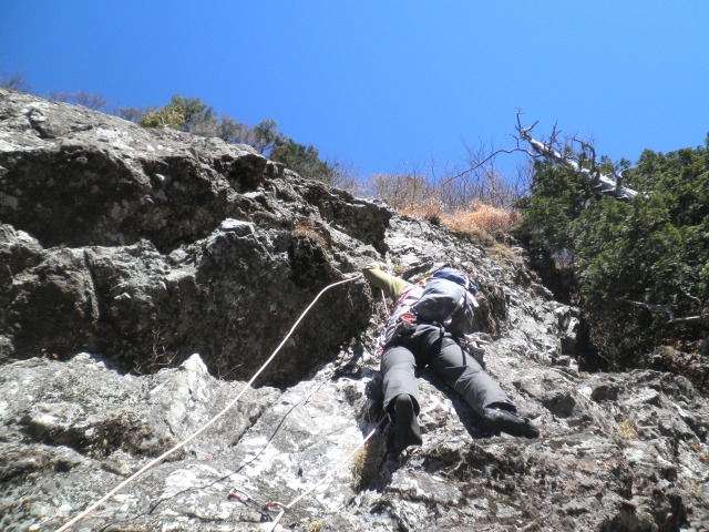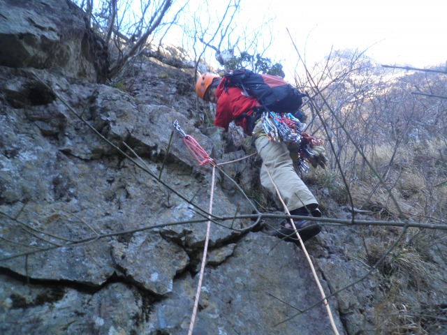 「ブッシュマン」は6ピッチ140mのルートで、ピン間隔も近くマルチピッチ入門の好ルート。ブッシュはすっかり落葉していて、秋晴れの中、快適な登攀が楽しめました。 (ナッキーニャ)
